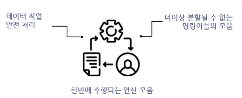 ✅ 데이터베이스 내에서 하나의 그룹으로 처리되어야 하는 명령문들을 모아 놓은 논리적인 작업 단위로, 여러 개의 명령어 집합이 정상적으로 처리되면 제대로 종료됩니다.