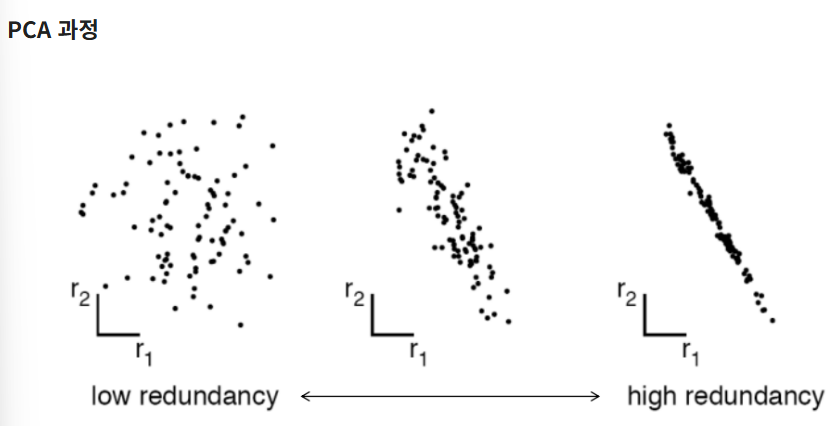pca에서는 자동으로 분산이 최대가 되는 방향, 즉 데이터 간의 중복성이 가장 적은 방향을 최적의 기저로 찾아낸다.