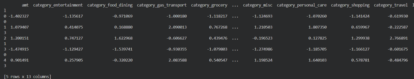 고객별 총 지불 금액과 카테고리별 지출 금액이 스케일링 된 상태로 출력됨.