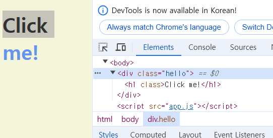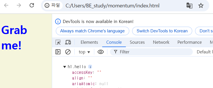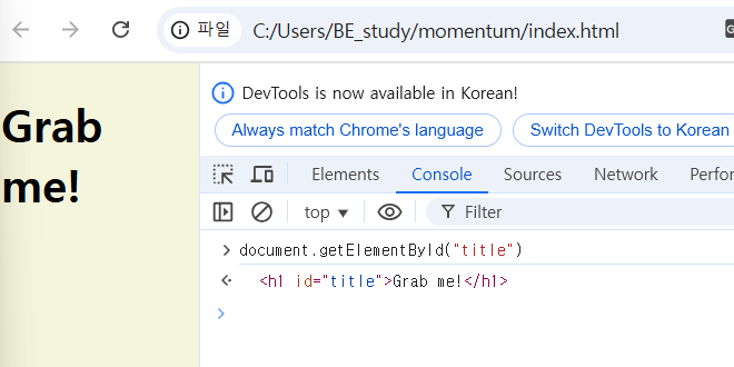 이 코드의 document.getElementById(“something”); 이 부분이 null이다. something이란 id를 가진 항목이 없기 때문이다. <h1 class="hello">Grab me!</h1> 여기서는 hello라는 class만 있을 뿐, title은 null인데 null의 innerText를 변경하려고 했기 때문에 오류가 난 것이다.