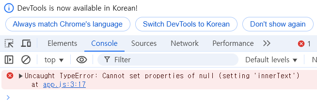 코드 내에 어떤 값이 null이라는 뜻이다. 즉, 내가 아무것도 없는 것(null)의 innerText를 접근하려고 했던 것을 의미한다.