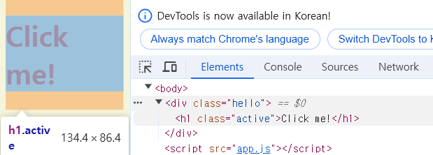 그리고 나서 JavaScript에서 h1에 active class를 전달해줘야 한다. 따라서 아래와 같이 코드를 작성할 수 있다.