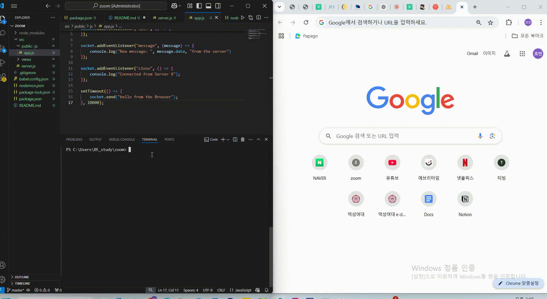 클라이언트가 서버와 연결되면 연결된 클라이언트의 socket 객체를 sockets 배열에 저장한다. 그리고 Connected to Browser를 출력하게 된다.