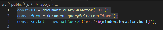 document.querySelector(“ul”): HTML의 <ul> 태그를 가져와 메시지를 추가할 때 사용하도록 했다.